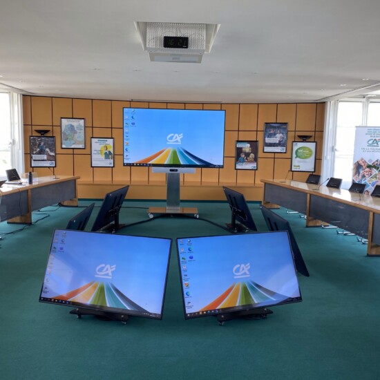 Aménagement d’une salle de réunion par TEDELEC : double affichage dynamique sur écrans mobiles, vidéoprojection centrale, sonorisation intégrée et mobilier équipé de connectique discrète. Une configuration idéale pour les grands comités, les ateliers de travail et les présentations hybrides.
